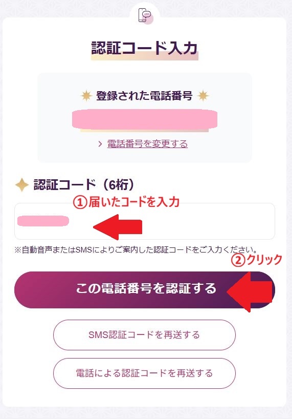 届いた認証コードを入力し、「この電話番号を認証する」ボタンをタップしましょう。