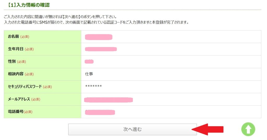 入力内容の確認画面に移ります。内容に間違いがなければ「次へ進む」ボタンをクリック。