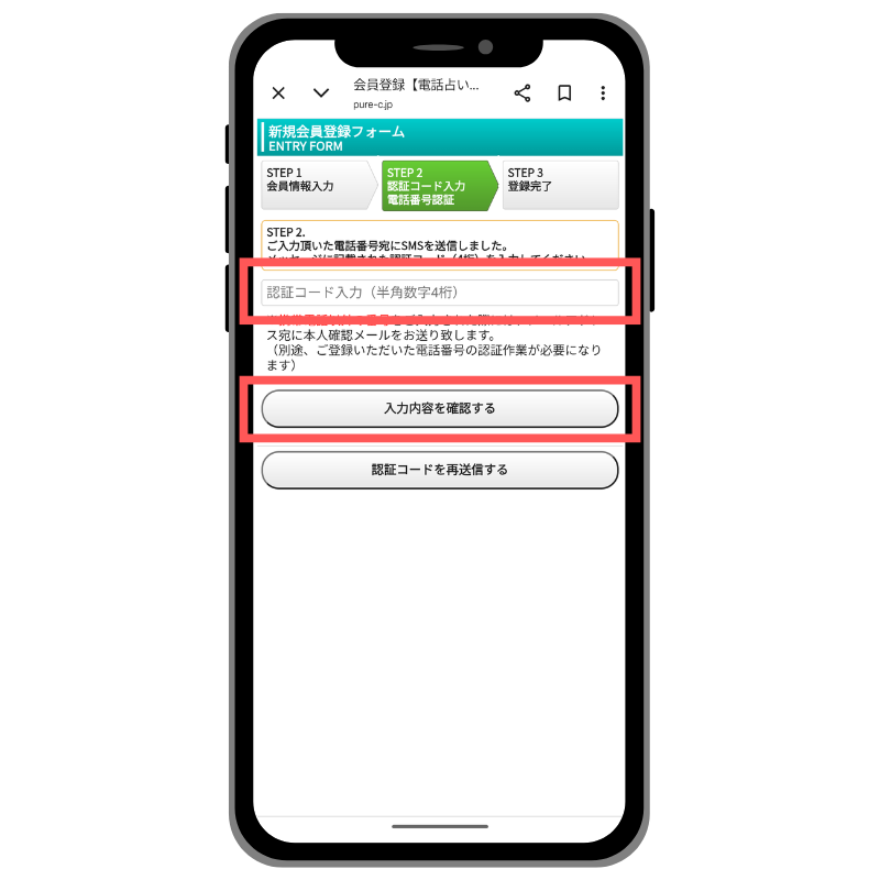 「STEP2」で入力した電話番号あてに認証コードが届くので、コードを入力して「入力内容を確認」をタップ